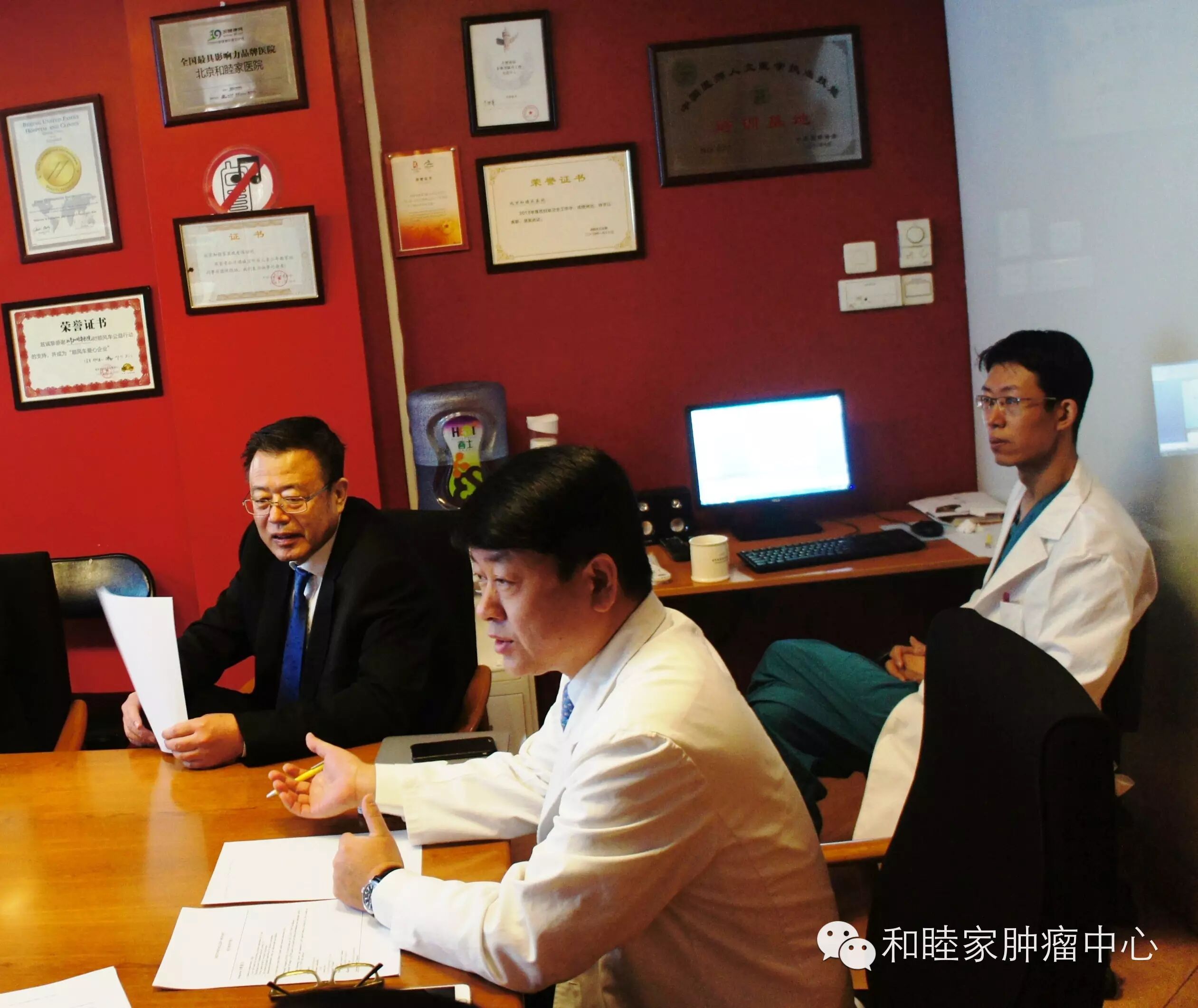 北京和睦家医院骨外科主任路继科医生(上图右二)、圆尾圭美医生(下图左一)、张建新医生(下图右二)讨论患者的脊柱重建手术方案,建议在手术当天,首先实施血管栓塞术,同期进行瘤体刮除及椎体固定重建手术,以减少手术造成的血行转移。